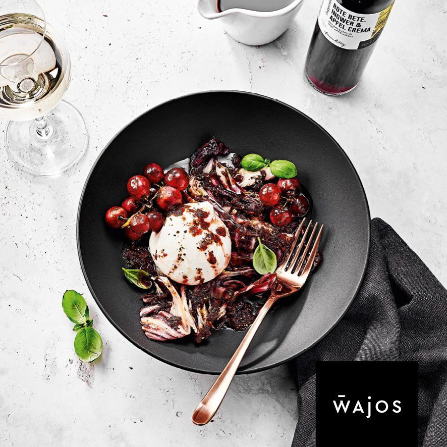 Burrata-Salat! Kategorie Portionen Zubereitungszeit Vorspeisen 4 30-Minuten Italienischer Käse, wie Mozzarella, Burrata oder Gorgonzola gehört einfach zu guten Vorspeisen. Besonders lecker schmeckt der Burrata Käse mit Radicchio oder Rucola Salat. Unsere Essigspezialität und unsere Bruschetta-Würzmischung verleihen dem Salat mit Burrata einen fruchtigen Geschmack. Zutaten 6 EL Wajos Rote Bete, Ingwer & Apfel Crema 6 EL Olivenöl, z.B. Wajos Basilikum auf Olivenöl 3 EL Wajos Basilikum Bruschetta Salz, Pfeffer 200 g rote Trauben ohne Kerne 1 Kopf Radicchio – in Spalten geschnitten 2 TL brauner Zucker 4 große Kugeln Burrata (alternativ Büffelmozzarella oder Mozzarella) 100 g Rucola Basilikum Zubereitung / Anleitung 1. Die Rote Bete, Ingwer & Apfel Crema mit Öl, Basilikum Bruschetta, Salz und Pfeffer zu einer Vinaigrette verrühren. Den Radicchio und die Trauben darin gut vermischen und etwa 30 Minuten marinieren lassen. Eine Grillpfanne stark erhitzen und den Radicchio sowie die Trauben mit einer Schöpfkelle aus der Marinade in die Pfanne geben. Mit Zucker bestäuben und karamellisieren lassen. Unter ständigem Rühren / Schwenken so lange anbraten, bis die Trauben aufplatzen und etwas Farbe annehmen. Dann Temperatur reduzieren, mit der Marinade ablöschen und etwas einköcheln lassen. 2. Nun jede Kugel Burrata auf einem Bett aus Rucola in mittelgroßen Schalen anrichten. Radicchio und Trauben hinzugeben, mit der eingekochten Marinade beträufeln und mit frischem Basilikum dekorieren. Gegebenenfalls mit Salz und Pfeffer nach Belieben würzen.