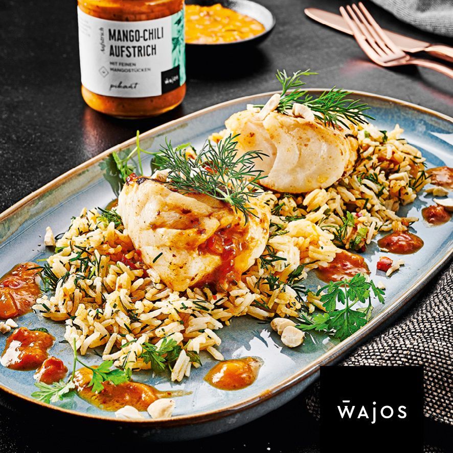 Kabeljau mit Mango-Chili-Füllung Rezept Kabeljau mit Reis und Gemüse ist ein echter Klassiker im Frühling. Dieses Fischrezept überzeugt durch die einzigartige Kabeljaufilet Füllung aus unserem Mango-Chili Aufstrich. Damit wird Kabeljau zubereiten ganz einfach! Zutaten: 250 g Reis Salz 4 Stück (ca. 600 g) dicke Kabeljaufilets 4 Salbeiblätter – grob gehackt 100 g Wajos Mango-Chili Aufstrich Butter oder Wajos Albaöl 10 - 15 g Dill / Kerbel – fein gehackt 50 g Cashewnüsse – gehackt Zubereitung / Anleitung: Den Reis in Salzwasser kochen. Die Kabeljaufilets unter fließendem Wasser abspülen und vorsichtig in der Mitte einschneiden. Von außen salzen und innen mit dem Mango-Chili Aufstrich und den Salbeiblättern füllen. Butter oder Albaöl in einer Pfanne erhitzen und Fisch darin von beiden Seiten braten. Den Reis, sobald er gar ist, mit restlichem Aufstrich und der Hälfte der Kräuter vermischen und nochmals kurz warm werden lassen. Den Fisch auf einem Teller anrichten und den Reis dazugeben. Vor dem Servieren mit Kräutern und gehackten Cashewkernen bestreuen.