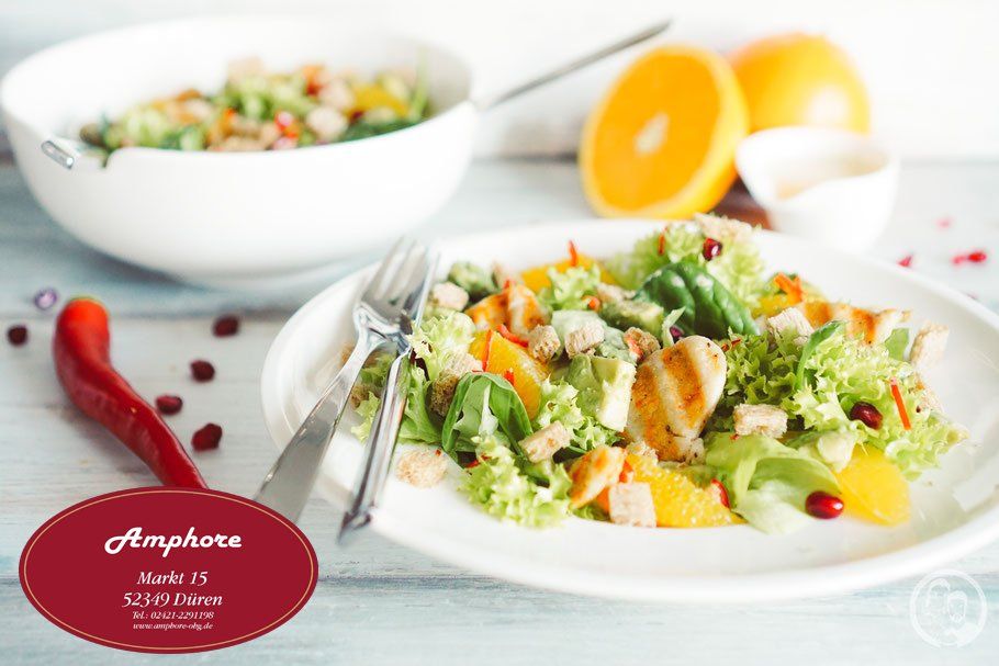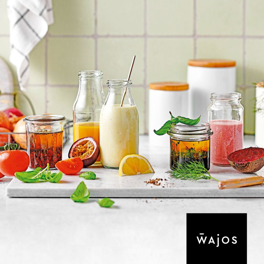 1. 3 EL Wajos Orange-Rosmarin Öl, 3 EL Wajos Schalotten Crema und 1 TL Senf, z.B. Wajos Orangen-Senf, miteinander vermischen und mit Salz und Pfeffer abschmecken.